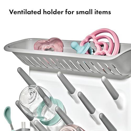 Un lugar para todas las cosas del bebé: pezones secos y mordedores en el compartimento superior, biberones y tazas secos en las 13 clavijas en ángulo, utensilios secos en las dos copas laterales y tapas secas y anillos de biberón en las dos bandejas inferiores con crestas elevadas para atrapar todos los goteos.