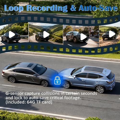 Grabación HD 2K y cámara trasera 1080P adaptador inalámbrico para juego de coche captura detalles ultra claros con lentes gran angular para eliminar puntos ciegos y mejorar tu seguridad máxima de conducción. Adaptador inalámbrico Carplay con grabación en bucle y el sensor G bloquea las imágenes de colisión, dispositivo rastreador para vehículos para guardar automáticamente evidencia crítica si ocurre un incidente. (tarjeta de 64 GB incluida)