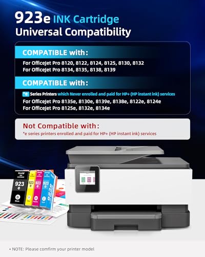 Compatibilidad de impresora: para cartuchos de tinta 923xl para impresora HP funciona para OfficeJet Pro 8120, 8122, 8124, 8125; OfficeJet Pro 8130, 8132, 8134, 8135, 8138, 8139; OfficeJet Pro 8120e, 8122e, 8124e, 8124e, 8139; OfficeJet Pro 8120e, 8124e, 8124e, 8139. 125;Oficina eJet Pro 8130e, 8132e, 8134e, 8135e, 8138e, 8139e