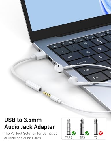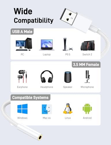Compatibilidad universal: adaptador de audio USB a conector de 0.138 in compatible con auriculares y micrófonos TRRS. Amplia compatibilidad USB macho con Windows 11/10/9/8/7/Vista/XP, Linux, Mac OS X Google Chromebook, Raspberry Pi, PS4, PS5 y Windows Surface 3, etc.