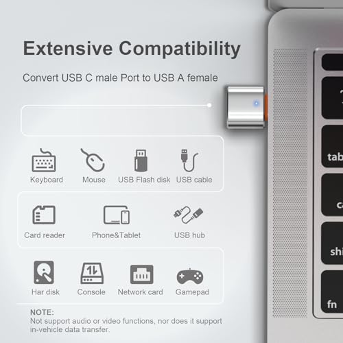 Compatibilidad universal: simplemente conéctalo para convertir la mayoría de los puertos USB-C macho en puertos USB-A hembra. Es compatible con varios dispositivos USB-C como unidades externas, computadoras portátiles, tabletas, almacenamiento USB, discos duros, cables de datos, lectores de tarjetas, micrófonos, etc. (NOTA: Al leer datos externos a través de este adaptador, asegúrese de que el dispositivo de almacenamiento USB conectado funcione correctamente y que el cable utilizado sea compatible con USB 3.0. Este adaptador no admite funciones de audio o video, ni admite la transferencia de datos en el vehículo)