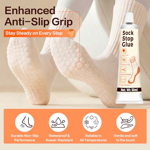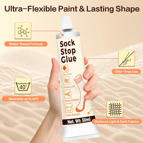 Fórmula transparente y segura: fabricado con una fórmula transparente, sin látex e inodoro, este pegamento para calcetines se mantiene suave y flexible después del secado mientras mantiene tus calcetines transpirables. Fabricado con materiales ecológicos que son suaves para la piel sensible, proporcionando una solución no tóxica para toda la familia