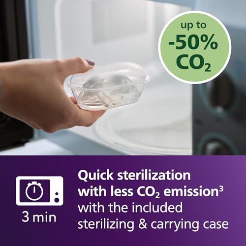 Estuche de transporte reutilizable que funciona como esterilizador para que los chupetes estén siempre listos para usar: añade agua y microondas durante 3 minutos para una fácil esterilización que genera hasta un 50% menos de emisiones de CO2³