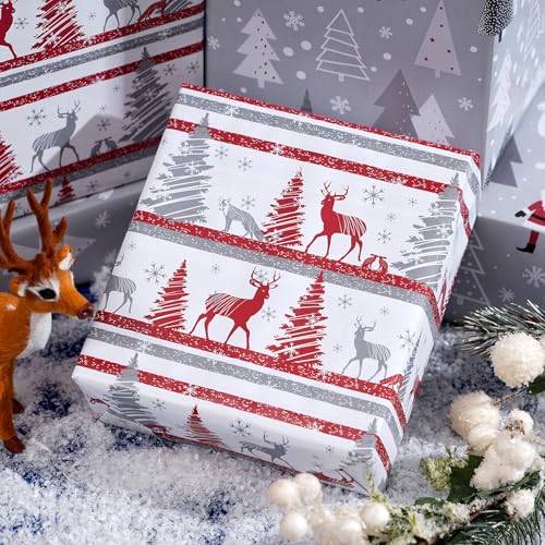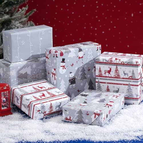 PlandRichW Papel de regalo de Navidad de invierno, 6 hojas de Navidad jumbo de 28 x 40 pulgadas con patrones de árboles, renos, Papá Noel y muñeco de nieve, papel de regalo navideño para todas las