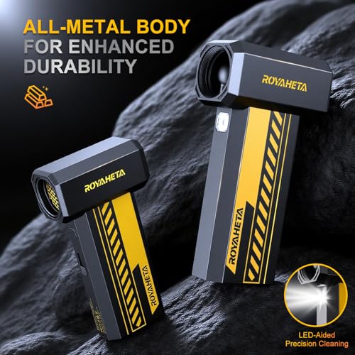 Cuerpo de aleación premium: el plumero de aire eléctrico cuenta con un cuerpo de aleación de aluminio totalmente metálico, que ofrece una durabilidad y longevidad superiores en comparación con los modelos de plástico. El plumero eléctrico tiene un diseño compacto y ergonómico que garantiza la comodidad y reduce la fatiga durante largas sesiones de limpieza. Incluye una interfaz de tuerca de 1/4 para el montaje del trípode y un práctico clip para fijar a tu cinturón o pantalones. Este mini soplador ofrece una construcción resistente de primera calidad para una solución de limpieza confiable a largo plazo