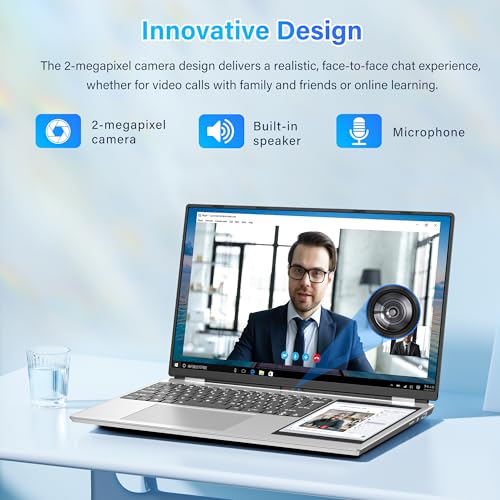 【Diseño innovador】① Diseño de pantalla dual: diseño especial de pantalla dual, compatible con la apertura y visualización simultáneas de múltiples aplicaciones, evitando cambios repetidos y movimiento de ventana. ② Cámara enchufable de alta definición, diseño de cámara de alta definición desmontable de 2 millones (garantiza seguridad y privacidad), ya sea videollamadas con familiares y amigos, aprendizaje de oficina o clases en línea, es como chat cara a cara.