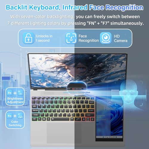 【Teclado retroiluminado de color y características】Pulsa «FN» + «F6» simultáneamente para abrir el teclado retroiluminado. Pulsa «FN»+»F7» simultáneamente para cambiar libremente los colores entre las 7 luces. El colorido teclado retroiluminado proporciona una mejor atmósfera visual. Se puede ajustar de acuerdo con las propias preferencias. Proporciona una gama de ricos puertos de conexión, WiFi de doble banda integrada, Bluetooth, USB 3.0 x 2, mini HDMI, conector para auriculares, ranura para tarjeta TF, etc., que se pueden conectar a varios dispositivos.