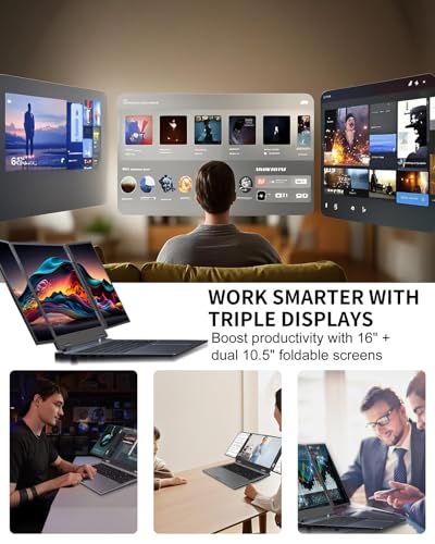 Inmersión de triple pantalla para trabajar y jugar: este portátil de pantalla triple de 16 pulgadas con dos pantallas plegables de 10.5 pulgadas ofrece una configuración multitarea masiva, ideal para desarrolladores, editores de video, operadores financieros y jugadores. Ya sea que estés trabajando en varios proyectos, editando metrajes 4K o ejecutando tu RPG favorito de mundo abierto, este portátil de 3 pantallas proporciona la pantalla de bienes raíces y flexibilidad que necesitas sobre la marcha.