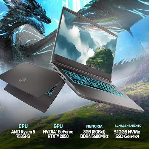 Especificaciones: Portátil gaming FHD MSI Thin A15 de 15.6 pulgadas y 144 Hz: Ryzen 5-7535HS, NVIDIA Geforce RTX 2050, DDR5 de 8 GB, unidad de estado sólido (SSD) NVMe de 512 GB, Cooler Boost 5, Win 11: color negro