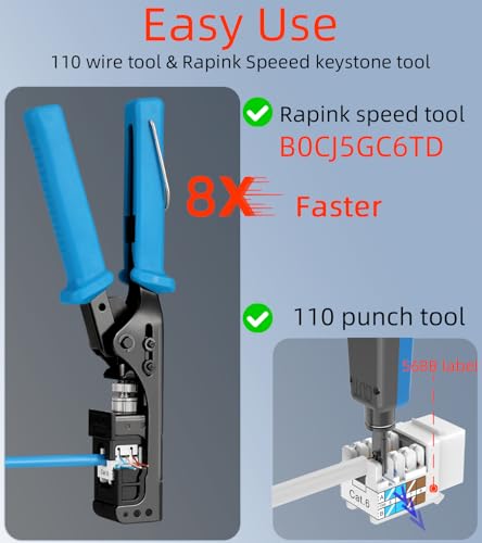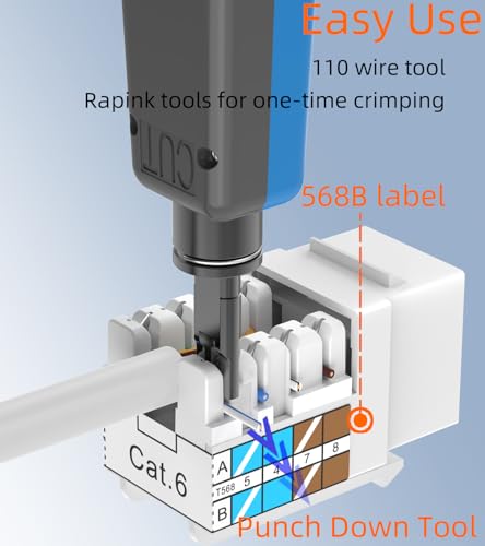 【Fácil de usar】: los conectores Keystone Ethernet son fáciles de usar y se pueden engarzar con la herramienta tradicional de 110 cables o herramientas de conectores Keystone Rapink para engarzar una sola vez, ahorrando tiempo y esfuerzo. Pasta de conector Keystone con etiquetas codificadas por colores T568A y T568B.