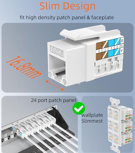 Ajuste universal: el conector de pared Rj45 está especialmente diseñado y se ha utilizado ampliamente en aplicaciones de centros de datos y redes domésticas. El conector Keystone Ethernet de tamaño delgado se ajusta fácilmente dentro y fuera del panel de conexiones, y cajas de superficie, placa de pared u otra aplicación.
