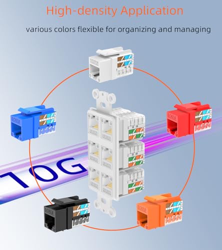 【Aplicación de alta densidad】: el gato 6 de tamaño delgado se utiliza para centros de datos y otros entornos de alta densidad donde el espacio es limitado. El conector Keystone Cat 6a está disponible en varios colores, flexible para organizar y administrar diferentes segmentos o servicios de red.