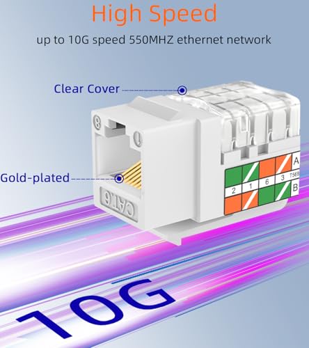 【Aplicaciones 10G】: Rj45 Keystone está chapado en oro y diseñado para transmisión de datos de alta velocidad hasta 10G velocidad 550MHZ red ethernet. El conector Ethernet Rj45 es compatible con el último estándar TIA-568.2-D.