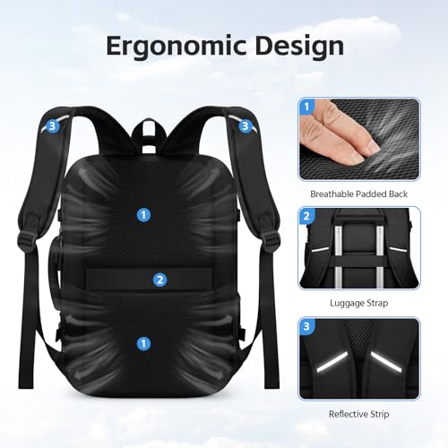 Gran capacidad con compartimentos científicos: esta mochila cuenta con un diseño compartimentado profesional para almacenar de forma segura los elementos esenciales para viajes de 3 a 5 días. El compartimento principal incluye correas de compresión elásticas integradas para evitar que se mueva la ropa. Una funda para laptop dedicada se adapta a portátiles y iPad de 17 pulgadas. El bolsillo frontal de acceso permite una rápida recuperación de artículos, mientras que los bolsillos laterales añaden comodidad adicional. Todo se mantiene organizado en su lugar para un acceso sin esfuerzo.