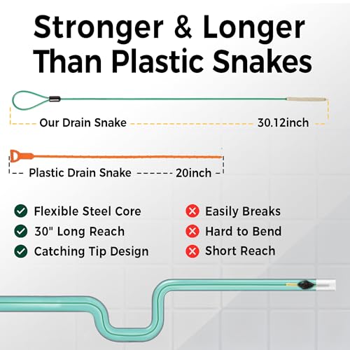 Diseño de punta mágica: la cabeza delgada de microgancho de esta herramienta limpiadora de drenaje pasa fácilmente a través de aberturas estrechas (solo 0.3 pulgadas de ancho) para agarrar el cabello sin atascarse. Con su longitud de 30 pulgadas, alcanza los zuecos profundos de forma suave y segura.