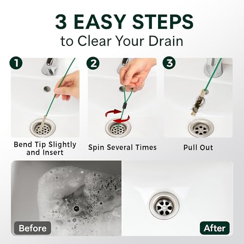 Fácil limpieza en 3 pasos: dobla ligeramente la punta, inserta en el desagüe y gira suavemente antes de sacarla. Repita hasta que esté claro. Esta eficiente herramienta eliminadora de obstrucciones de drenaje restaura el drenaje en minutos sin la molestia de un montaje complejo.