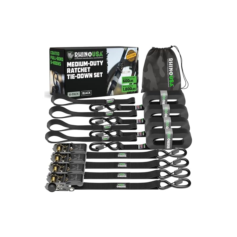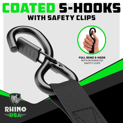 Especificaciones: Rhino USA Correas de trinquete de amarre (paquete de 4) – 1 pulgada x 15 pies (1,823 libras de resistencia a la rotura) – Correas de amarre definitivas con ganchos en S de seguridad – Correas de