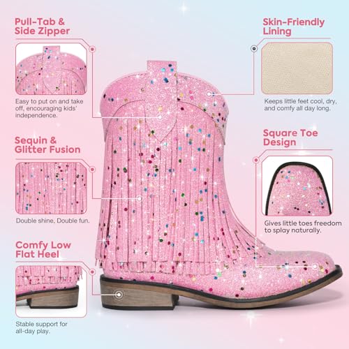 Rollda Botas Vaqueras con Flecos, Botas de Vaquero con Purpurina para Niñas, Botas de Punta Cuadrada con Brillos para Niños para Fiestas de Cumpleaños y Bodas, Niño Pequeño/Niño Chico/Niño Grande