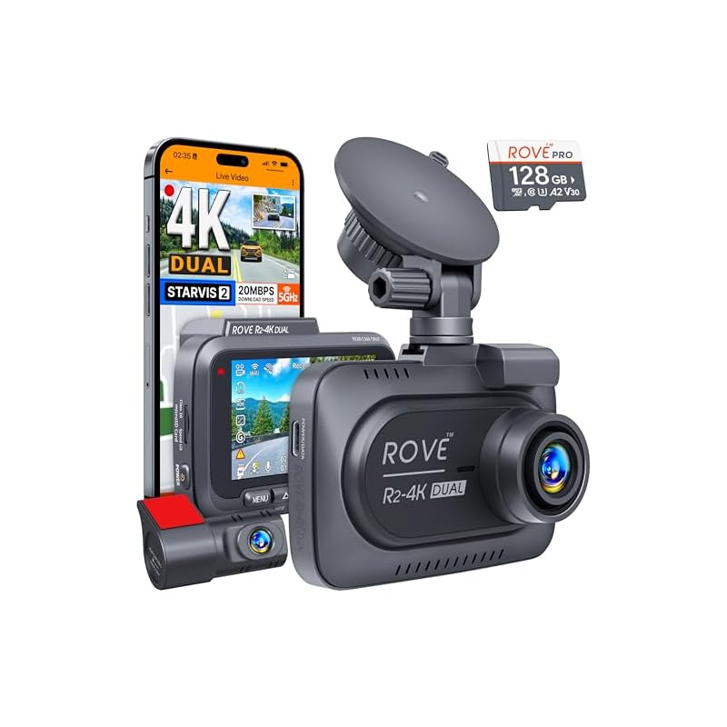 Especificaciones: ROVE Cámara de tablero dual R2-4K frontal y trasera, sensor STARVIS 2, tarjeta de 128 GB incluida, WiFi 5G, velocidad de descarga más rápida de hasta 20 MB/s con aplicación, cámara de tablero 4K