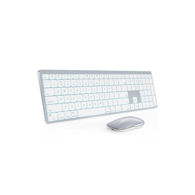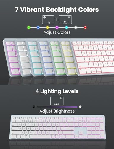 Especificaciones: SABLUTE Teclado y mouse Bluetooth para Mac: retroiluminación de 7 colores, multidispositivo, recargable, de tamaño completo, teclado inalámbrico y mouse combinado con teclas silenciosas de interruptor