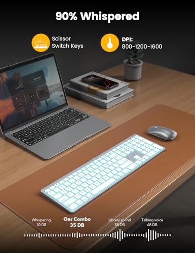 Teclas receptivas y escritura silenciosa: escriba cómodamente con teclas sensibles y de bajo perfil que proporcionan una sensación táctil similar a una computadora portátil. Tanto el teclado como el mouse están diseñados para un funcionamiento silencioso. El mouse también cuenta con tres ajustes de DPI ajustables (800/1200/1600) para un control preciso del cursor