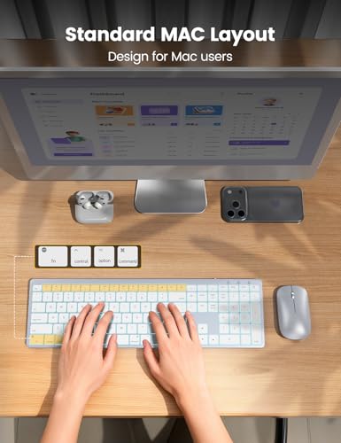 Hecho para Mac: diseñado exclusivamente para Apple. Este teclado cuenta con el diseño estándar completo de Mac y todas las teclas de acceso directo de macOS en las que confía para un flujo de trabajo perfecto. Disfruta de compatibilidad instantánea con tu MacBook Pro/Air, iMac, Mac Mini, iPad y iPhone (solo Bluetooth: este dispositivo se conecta a través de Bluetooth y no incluye un receptor USB. Asegúrese de que su dispositivo tenga Bluetooth habilitado. Nota: Los accesos directos y las teclas de Mac son incompatibles con Windows.)