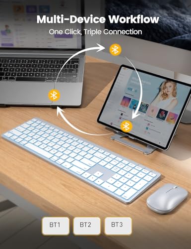 SABLUTE Teclado y mouse Bluetooth para Mac: retroiluminación de 7 colores, multidispositivo, recargable, de tamaño completo, teclado inalámbrico y mouse combinado con teclas silenciosas de interruptor