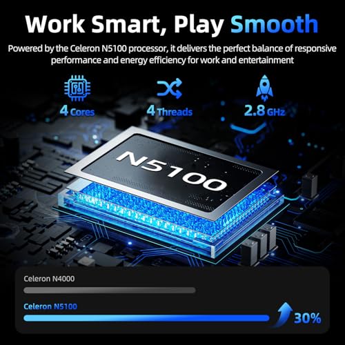 Rendimiento eficiente y batería de 8000 mAh: la computadora portátil funciona con el último procesador Celeron N5100 (hasta 2.90 GHz), este portátil portátil garantiza un rendimiento multitarea y multimedia fluidos. Puede ejecutar aplicaciones rápidamente y acceder a los datos de manera eficiente. La potente batería de 8000 mAh permite un uso prolongado durante el estudio, el trabajo o el entretenimiento sin la necesidad de recarga frecuente, satisfaciendo perfectamente las necesidades diarias