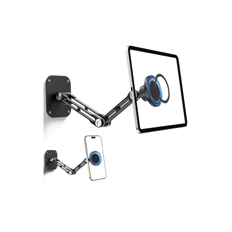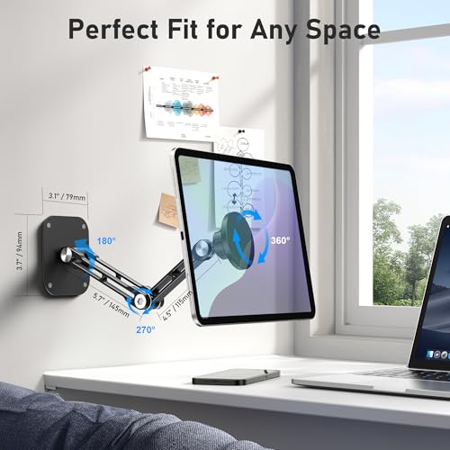 Especificaciones: Soporte magnético de pared para iPad, soporte de pared de aluminio de doble brazo para tableta, 360° ajustable multiángulo, plegable, para iPad Pro/Air/Mini, teléfonos y tabletas, imanes