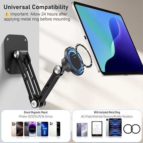 Soporte magnético de pared para iPad, soporte de pared de aluminio de doble brazo para tableta, 360° ajustable multiángulo, plegable, para iPad Pro/Air/Mini, teléfonos y tabletas, imanes