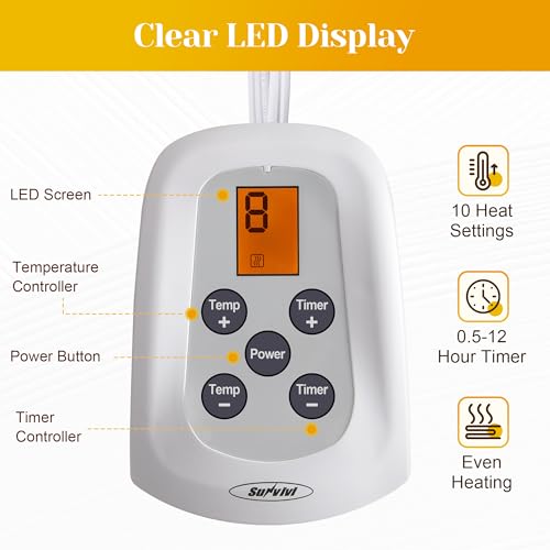 Fácil de usar y seguro: con un cable de alimentación de 6.4 pies y una línea de control de 13.3 pies, nuestra manta térmica Sunvivi permite libertad de movimiento. Puedes controlar la temperatura con 10 niveles de calefacción que van desde 89 a 108 °F, y la manta promueve la circulación sanguínea mientras te relajas. Tiene una función de apagado automático de 0.5 a 12 horas para garantizar un uso seguro sin preocupaciones