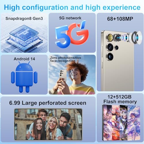 Android 14.0 + 6.99 HD: este es un teléfono celular Android con una pantalla grande, pantalla HD de 6.99 pulgadas + 1440 x 3040. Este teléfono Android 14.0 I25 Ultra desbloqueado está equipado con una cámara principal de 108 MP y una cámara frontal de 68 MP, mejor grabación de una vida hermosa y muestra tu belleza. Y tiene reconocimiento facial y desbloqueo de botón de huellas dactilares y botón rápido para tomar fotos, lo que protege eficazmente tu privacidad.