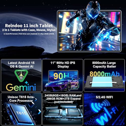Especificaciones: Tableta 2025 de 11 pulgadas, Android 15 tabletas con teclado, 24 GB+256 GB+2 TB Expand, Octa-Core, 8000 mAh, Tablet PC con WiFi 5G/2.4G, BT5.0, GMS, GPS, tabletas 2 en 1 con funda, mouse, lápiz óptico