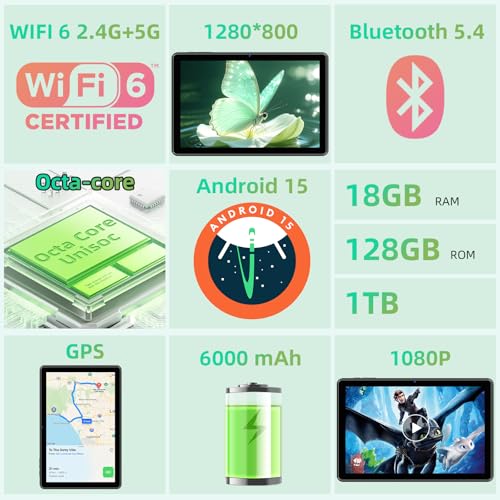 Especificaciones: Tableta Android 15 de 10 pulgadas, 18GB RAM 128GB ROM 1TB Expand, procesador Octa-Core, 1280×800 IPS Widevine L1, WiFi 6, cámara dual de 8MP+5MP, BT5.4, 6000mAh, GPS, carga rápida tipo C