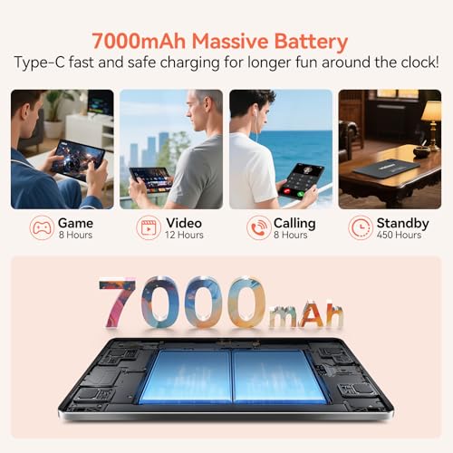 Batería de larga duración de 7000 mAh: esta tableta de 11 pulgadas viene con una potente batería de 7000 mAh diseñada para la duración de la batería. Soporta hasta 10 horas de uso mixto: transmite películas, navega en línea o aborda tareas de trabajo sin carga constante. Recarga rápidamente a través del puerto USB tipo C y mantente alimentado durante tus días más ocupados.