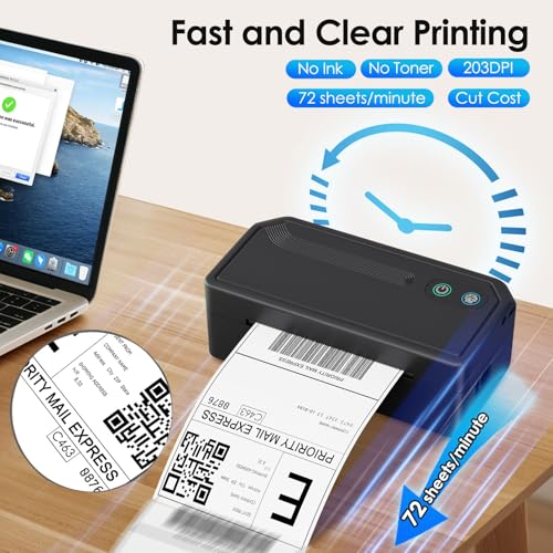 High Quality Thermal Printer – Direct thermal printing technology is adopted, prints by heat, no need ink or toner. All you need is thermal labels. It also features automatic calibration and paper return, to simplify the operation, save your time and cost. Equipped with reliable print head and heat dissipatoin device to achieve high printing speed of 6.3 inch/s(72 sheets of 4×6 labels/minute) , 203DPI high resolution makes the printing more clearer
