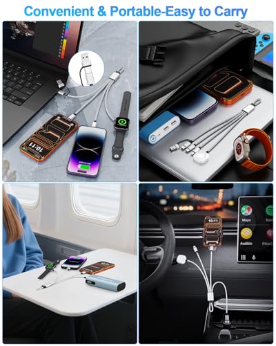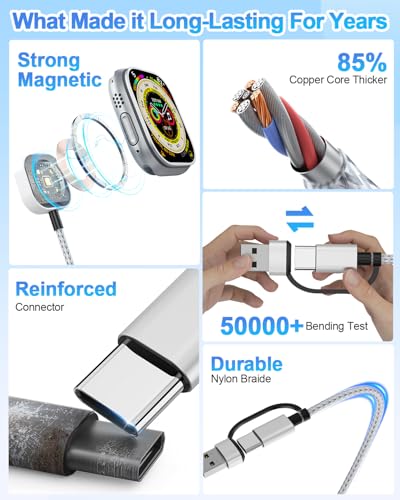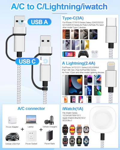 🎁【3-in-2 Multi Charging Cable】3-in-2 multi charging cable provide 6 charging modes (USB-C/A for Apple Watch charger, Lightning, and Type-C),which compatible with iWatch Series 1-11, SE, and Ultra models, the Lightning cable is compatible with iPhone14/13/12/Pro/Max/iPad,USB C is for iPhone 16/16 Pro/16 Pro Max/15/15 Pro/15 Pro Max,Samsung Galaxy
