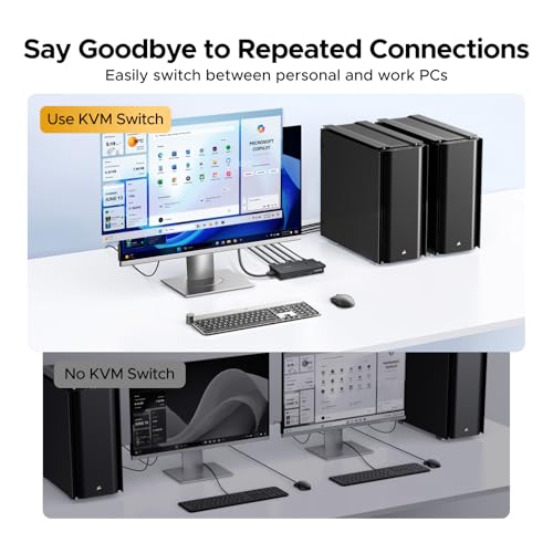 Dos formas de conmutación: El conmutador KVM 4k ofrece dos formas de conmutación, un botón en el conmutador y un controlador de escritorio. El control remoto te permite colocar el interruptor KVM fuera de la vista o más lejos, manteniendo tu escritorio limpio y organizado. Simplemente coloque el control remoto al alcance de la mano y, con una simple pulsación, cambie rápidamente entre dos computadoras, haciendo que su escritorio esté más ordenado y mejorando la productividad. NOTA: No es compatible con conmutación de teclas de acceso rápido y emulación EDID