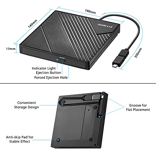 【USB 3.0 de alta velocidad y tipo C】La unidad externa Amicool CD ROM adoptó tecnología de grabación avanzada, compatible con DVD+R, DVD, CD-ROM, DVD-ROM, CD-R, CD-RW. Con USB 3.0 y interfaz tipo C. Velocidad máxima de lectura de DVD 8x; Velocidad máxima de lectura de CD 24x y velocidad máxima de grabación de CD 8x. lo que le brinda una velocidad de transmisión de datos más rápida (máximo 5Gbps), reproduce música y películas sin retraso ni distorsión.