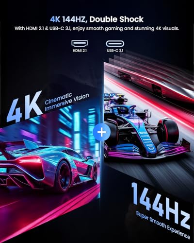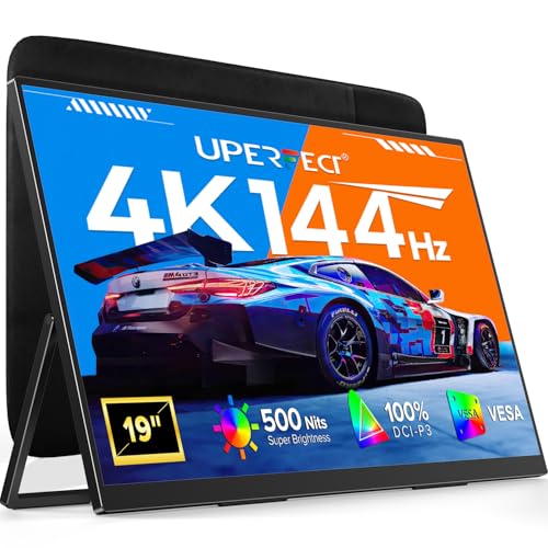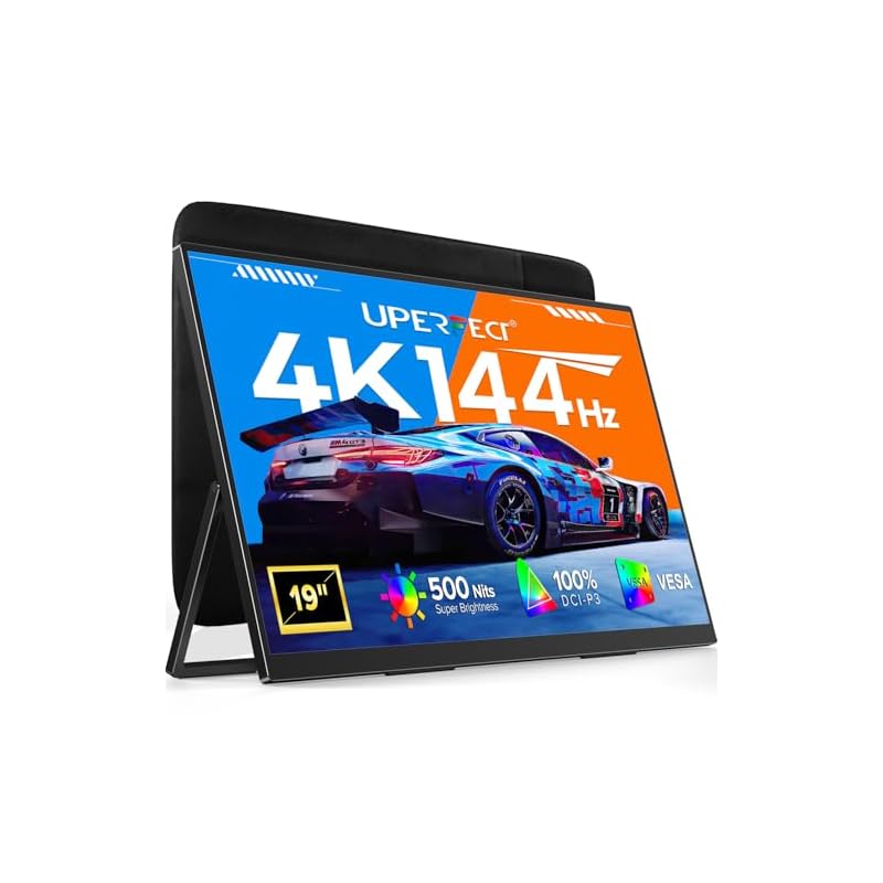 UPERFEC Monitor portátil 4K 144Hz QLED, 19″ UHD 3840×2160, 500 nits, 2000:1, 100% DCI-P3, 0.1ms, USB-C y HDMI, soporte integrado y montaje VESA, monitor de juegos de viaje para laptop, PC y consolas