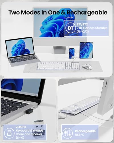 Dos modos y recargable: el bonito teclado y mouse inalámbricos V3 proporcionan 2 modos, Bluetooth 5.0 y 2.4GHz, satisfaciendo tus necesidades de trabajo, juego y estudio. El combo de teclado y mouse inalámbrico comparte un receptor USB para lograr una conexión de hasta 32.8 ft (33 pies). Presione la combinación de teclas FN+1/2/3 para ingresar al modo 2.4G/BT1/BT2. Con el cable tipo C, puedes usarlo para cargar el teclado inalámbrico en blanco y puedes escribir o jugar juegos sin interrupciones mientras se carga.