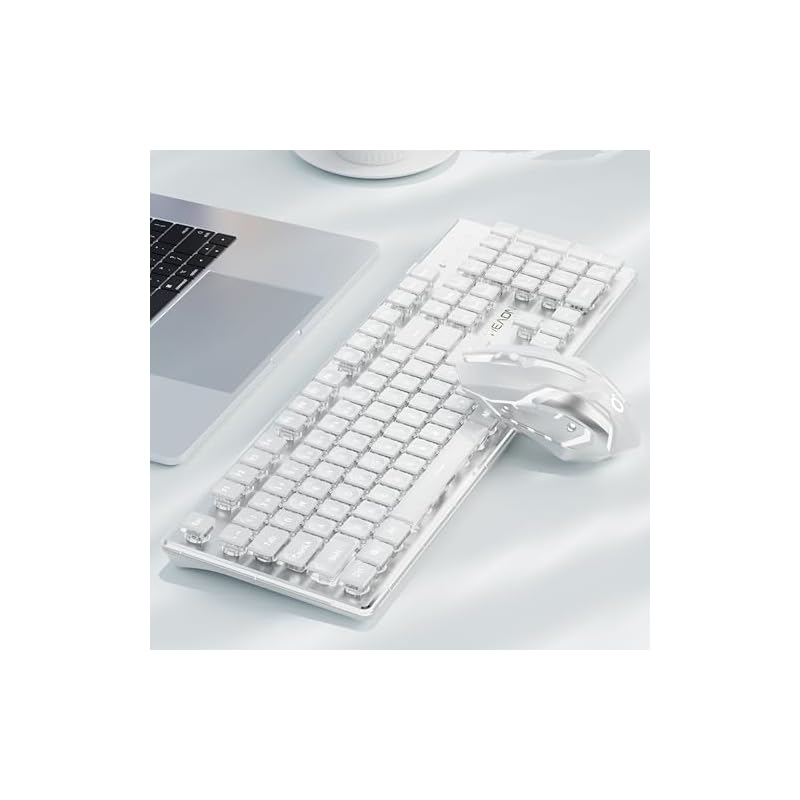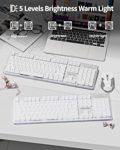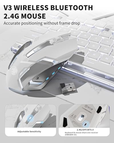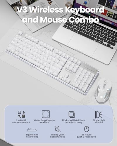 Ratón silencioso inalámbrico y compatibilidad universal: el teclado blanco V3 viene con un mouse silencioso inalámbrico que admite carga tipo C, para que pueda jugar mientras se carga. El ratón tiene 3 niveles de sensibilidad. Este combo inalámbrico de ratón y teclado funciona con tu PC, escritorio, laptop o portátil. Compatible con Windows, Linux, Chrome y Mac.