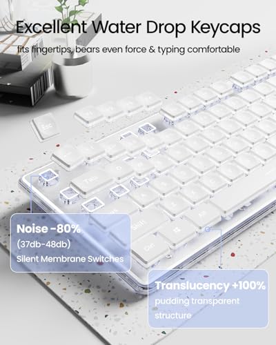 Teclas de gota de agua mejoradas y menos ruido: el teclado inalámbrico de tamaño completo utiliza teclas de caída de agua suspendidas mejoradas con gran transmisión de luz. La superficie de las teclas de diseño cóncavo y convexo, que se adapta bien a las yemas de tus dedos, escribiendo o jugando de manera más cómoda y fácil. También es más silencioso, reduciendo el ruido de escritura en un 95%. Con el mouse silencioso inalámbrico, ya no te preocupes por las perturbaciones de ruido en la biblioteca, cafetería, oficina o dormitorio.
