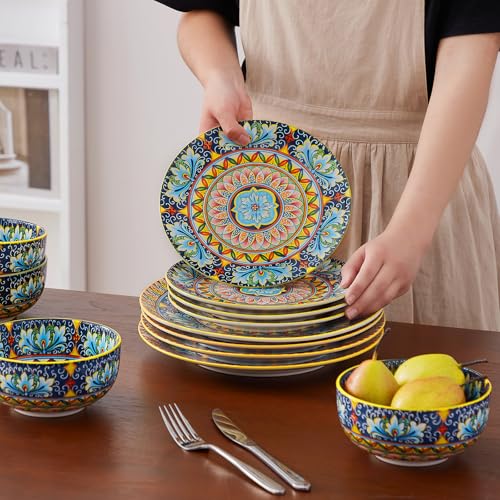 vancasso Juego de vajilla de 12 piezas, platos y cuencos amarillos, juego de platos de porcelana para 4, aptos para microondas y lavavajillas, resistente a los arañazos, estilo bohemio, servicio de