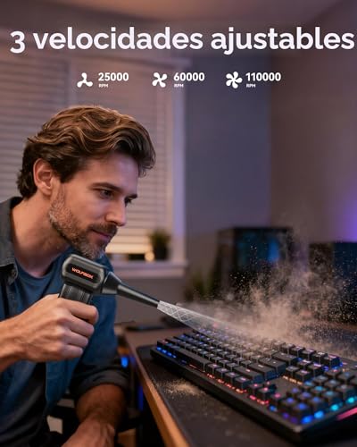 Plumero de aire de potencia de 110.000 RPM: diseñado con un motor sin escobillas que alcanza hasta 110.000 RPM en tercera marcha. Este plumero eléctrico elimina el polvo microscópico y las migas de teclados, cajas de computadora y ventiladores de radiador. «Mantenimiento en 1 minuto, limpieza profunda de 10 minutos» para jugadores de PC y entusiastas de la tecnología.