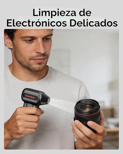 WOLFBOX MF60 – Plumero de aire comprimido de 110000 rpm, soplador de aire eléctrico de 3 velocidades, ajustable, recargable, con carga rápida para limpieza de teclado de PC, automóvil, hogar, 5 boquillas