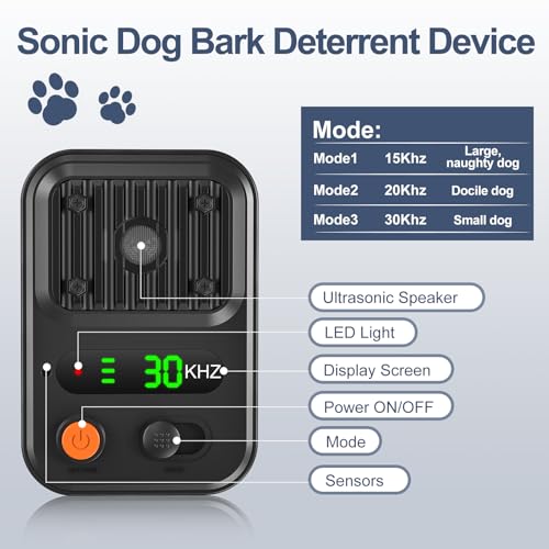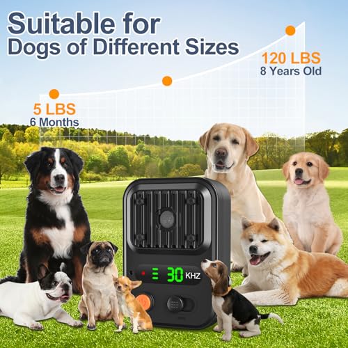 3 modos ajustables: hay 3 modos de ajuste, 1 modo 1 (15-30 kHz): frecuencia variable, adecuado para perros traviesos o grandes, modo 2 (20 kHz): más adecuado para perros suaves, y modo 3 (30 kHz): más adecuado para perros pequeños, el dispositivo ultrasónico de control de ladridos para perros se puede ajustar para detectar ladridos desde un rango de distancia. Es decir, haciéndolo efectivo para Perros de todos los tamaños. Ya sea en interiores o exteriores.