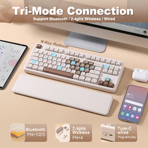 Conectividad trimodo y batería de 4000 mAh: con tecnología de conexión tri-modo, incluido Bluetooth, 2.4G inalámbrico y cable USB; este teclado inalámbrico puede conectar hasta 5 dispositivos simultáneamente y es compatible con Win, Mac, Linux, iOS y Android. Lo que significa que el usuario puede cambiar sin problemas entre dispositivos para aumentar la productividad. Viene con una batería integrada de 4000 mAh, lo que permite un uso prolongado sin carga frecuente, por lo que es ideal tanto para el hogar como para la oficina